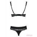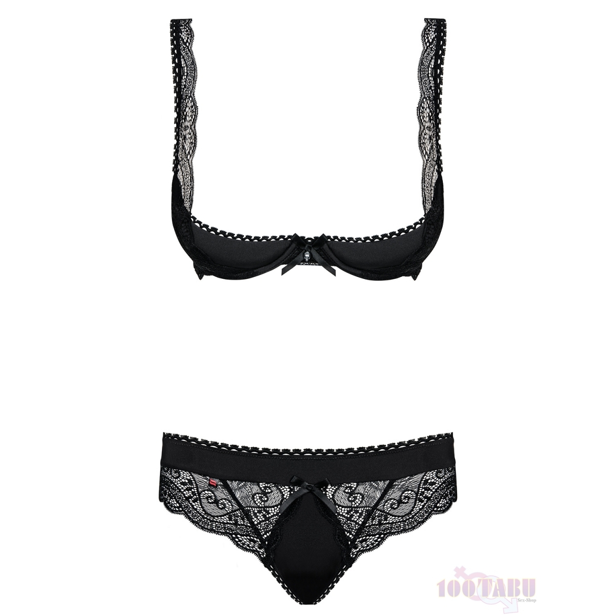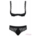 Um conjunto muito sensual e erótico composto por um sutiã de copas push-up almofadado com abertura na parte superior e uma cueca cavada a combinar, com renda igual na parte da frente.