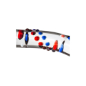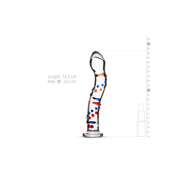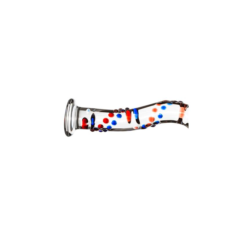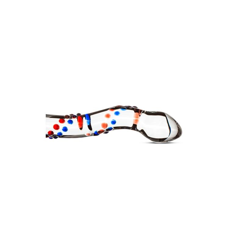 O dildo é feito de vidro e possui bolinhas azuis e vermelhas para um visual único.